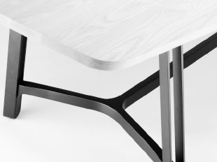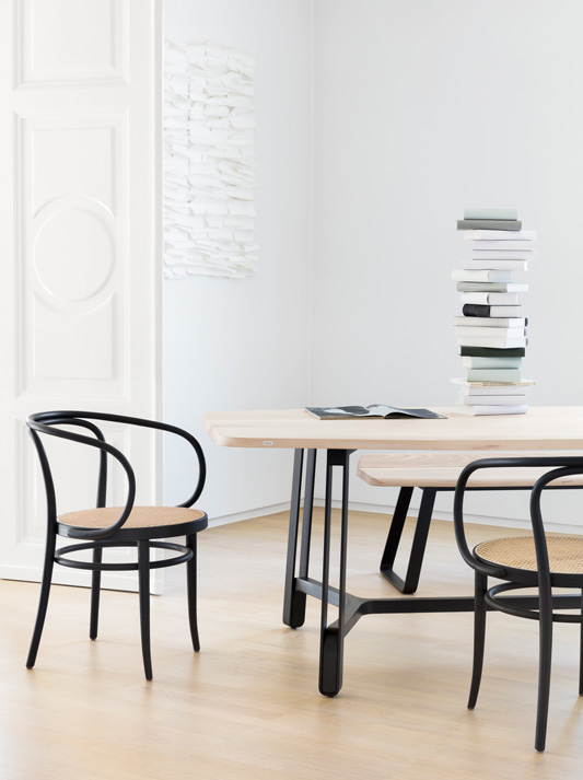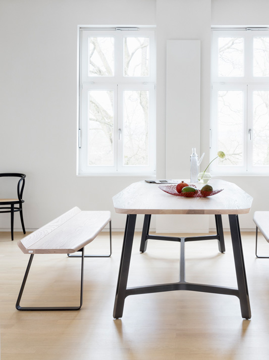 Conviviality and functionality – the dining table S 1092 is a real statement: robust and yet dynamic and open, the long table is an invitation for eating, playing, working or just comfortably spending time together. In combination with the matching benches, the generous seat group functions as a versatile communication platform. The wood of the tabletop, seat and backrest, the frames made of bent flat steel and the bentwood elements of the table’s optional leg traverse form a suspenseful and diversified mix of materials. The long tabletop is characterised by tapering edges towards its ends and rounded corners. The veneered version has a straight edge. The frame, made of thin bent flat steel in a black cast iron look has an especially lightweight appearance thanks to generous recesses under the table, which also provide stability. Designer Randolf Schott was inspired by classic refectory tables that have their origin in the dining halls of monasteries. The two bench models speak the same design language as the table. The angled back of the bench S 1094 without backrest provides a secure seat.