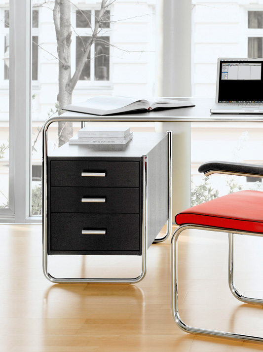 It is as though Marcel Breuer had anticipated today’s home offices and mobile computers: The compact tubular steel desk S 285 that he designed is an elegant companion for modern lifestyle and work. Marcel Breuer’s tubular steel desk S 285 for Thonet is a successful example of the programmatic Bauhaus claim to combine art and technology into a new entity. Breuer was a trained joiner and he combined his knowledge of tubular steel as a material with his experience in interior design. The tabletop and storage elements made of varnished or stained wood harmoniously fit into the tubular steel frame. The supporting frame consists of a curved line, and the wooden elements characterised by clear forms seem to float in it. This piece of furniture with its formally balanced proportions represents an important piece of contemporary history, known as “The New Objectivity”. Thonet produces various versions of this striking model.
