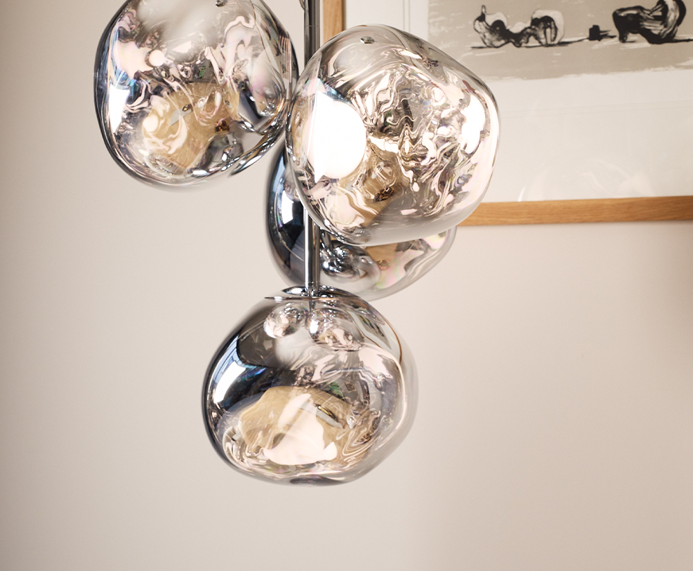 Obsessed with the idea of creating an imperfect, organic and naturalistic lighting object, Melt was created in collaboration with FRONT – a Swedish design collective. Melt is evocative of molten glass, the interior of a melting glacier, or images of deep space.