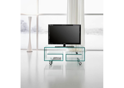 Glass TV unit. Very practical thanks to the movement on castors and shelves.