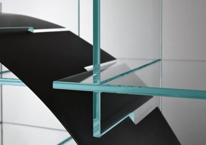Interlocking geometric component made of thin metal sheet in the shape of an arch or circle in brushed bronze or brushed black finish.