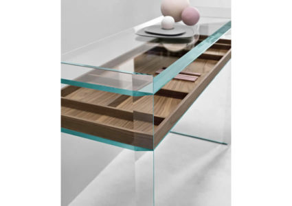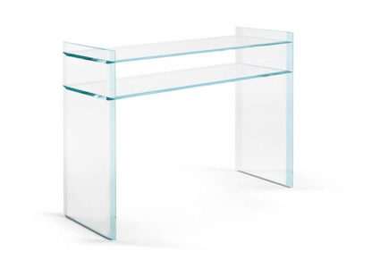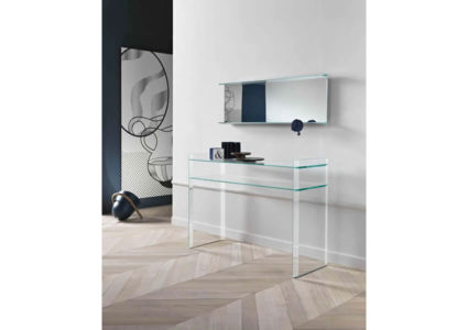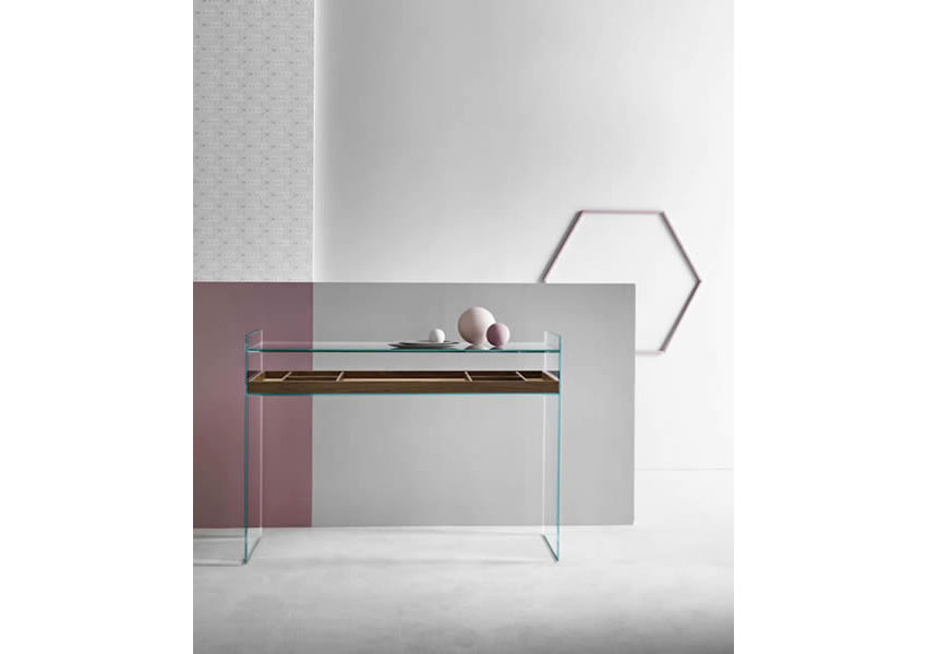 Console with glass shelf. This unit may be complemented with a tray in solid walnut canaletto wood or mat white MDF in between the two shelves
