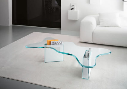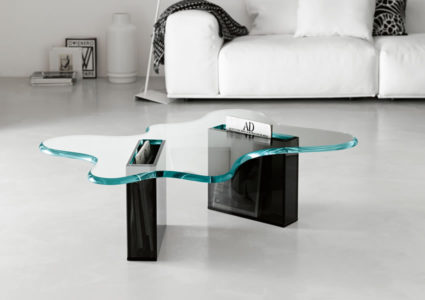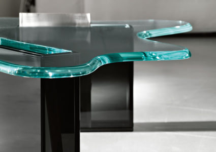 Top in extraclear glass 2cm thick with rounded edge. Boxes available in extraclear, smoked or white lacquered glass.