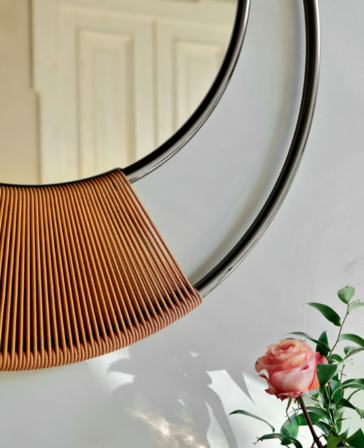 Un delicato intreccio in tessuto, sapientemente lavorato a mano, sostiene uno specchio dalle finiture bronzate o grey. Una struttura in metallo cromato, un cerchio protettivo per lo specchio, forma una figura leggera e presente, che si completa con tre particolari in legno massello. Un pendente per rendere indimenticabile ogni parete.