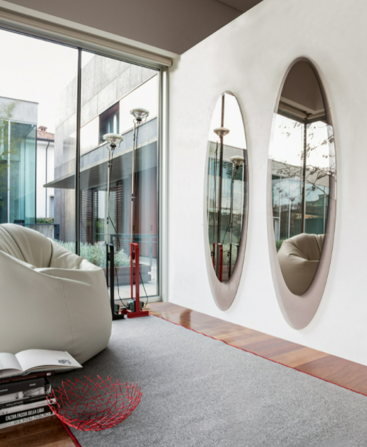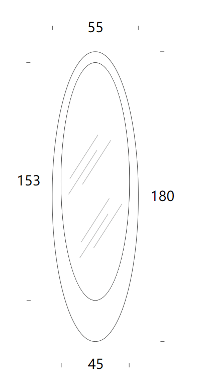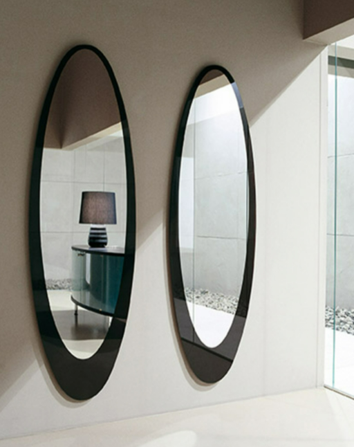 La specchiera Olmi ricorda una coppia di ellissi, lievemente allargate verso il basso, che siano uscite l'una dall'altra. La prima, la base, serigrafata o bronzata in varie finiture, lascia spazio al suo interno allo specchio vero e proprio, anch'esso bronzato o argentato.