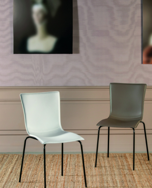 Aria élite è caratterizzata da una linea sinuosa, leggera e morbida, rivestita in cuoio con base in finitura cromo nero. Una sedia adatta ai più diversi contesti, impilabile, con scocca in stampato polimerico e struttura in metallo laccato o cromato.