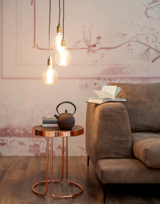 Un unico design per un tavolino o un più piccolo servetto; una struttura snella e affusolata, in cromo bronzato oppure ramato; un classico piano rivestito di noce o rovere scuro termotrattato: Cora.