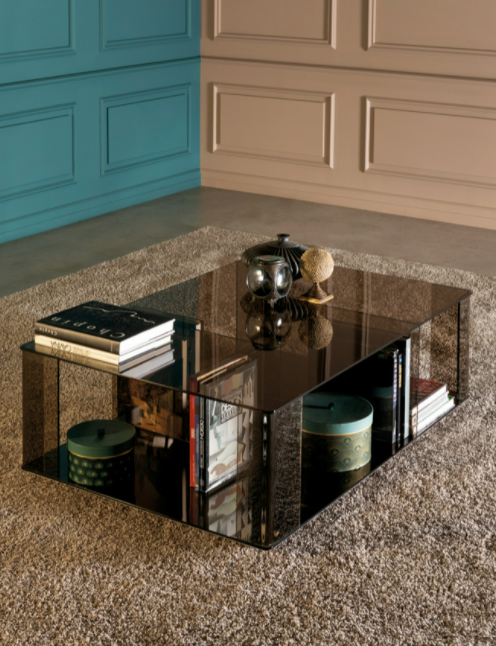 Tavolini Dedalo in vetro trasparente, extrachiaro, bronzo e fumè con base specchiante abbinata alla struttura. Il nome, che riprende l’ideatore del famoso labirinto cretese nel mito greco, è un chiaro riferimento al suo particolare design.