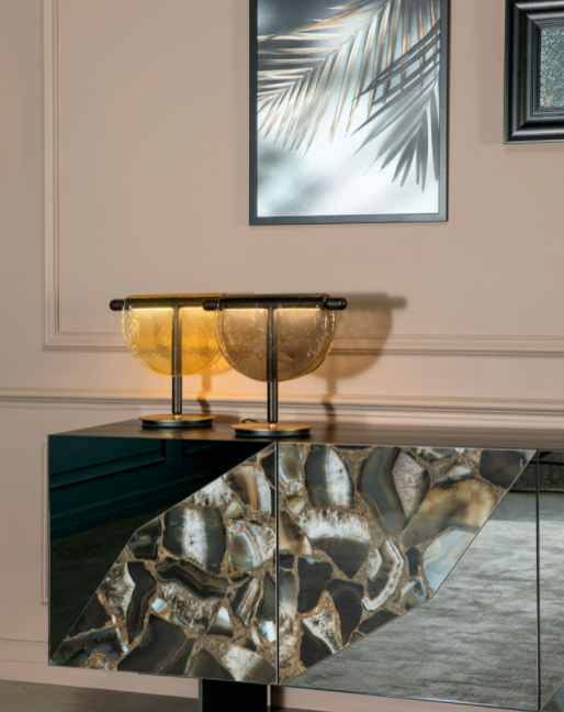 La purezza del design incontra la preziosa lavorazione artigianale nella raffinata madia Alcione, caratterizzata dall’elegante combinazione di porcellana e vetro sulle ante. La manifattura esclusiva e la fusione dei diversi materiali crea una continua variazione di luminosità, dall’estetica potente.