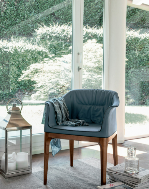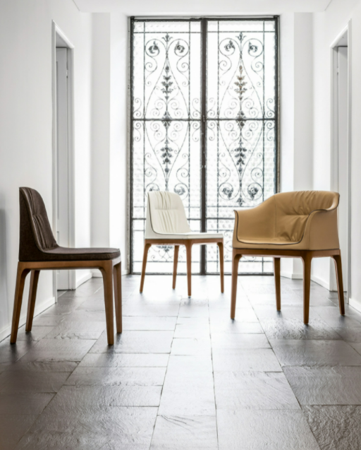Il poliuretano schiumato a freddo della struttura rende Mivida una sedia eccezionalmente comoda. Il design di Angelo Tomaiuolo è raffinato ed elegante, sia nella versione con braccioli, che in quella senza. Il rivestimento in pelle, eco-pelle, pelle fiore o pelle nabuk viene esaltato dalla raffinata cordonatura.