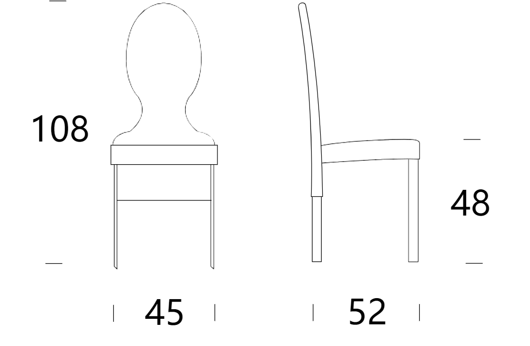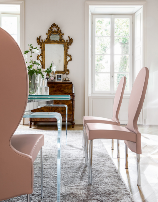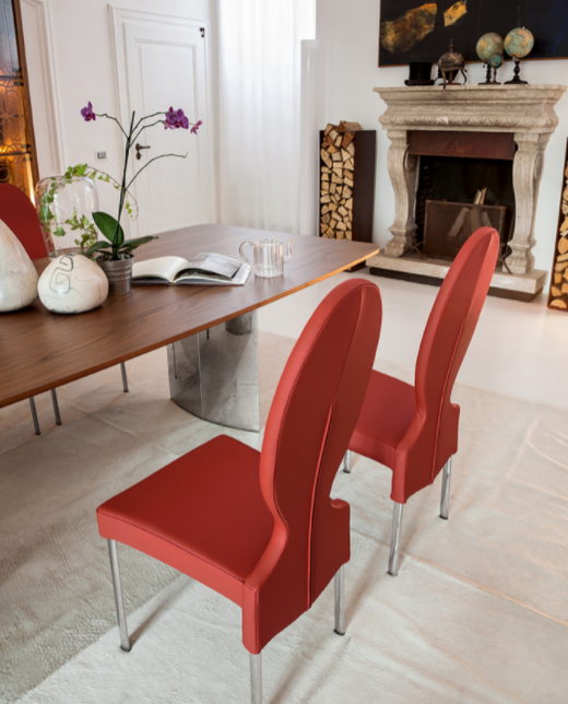 Sedia in poliuretano schiumato, con rivestimento in pelle, eco-pelle, tessuto verbena, tessuto ninfea. Una grande varietà di finiture che si abbinano eccellentemente con lo schienale dalle forme particolari e femminili. Un contemporaneo incanto d'altri tempi.