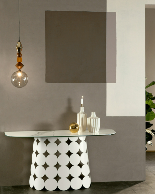 Il sapore ed il ricordo di una cornice d’altri tempi, creata grazie ad una tecnologia del tutto contemporanea, che rende il taglio della base di Pois una combinazione di arte e manifattura. Il metallo verniciato si apre nella fantasia di spazi aperti e chiusi, e sostiene perfettamente i piani in legno massello o grès porcellanato di un tavolo che vive da protagonista in ogni living.