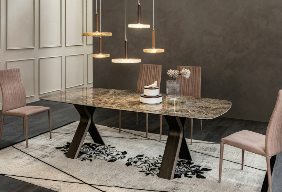 Tavolo fisso o allungabile con base in legno termocurvato, pensata per essere abbinata ad eleganti piani in vetro o gres porcellanato o vetroceramica. Le linee più semplici possono essere le più eleganti e senza tempo.