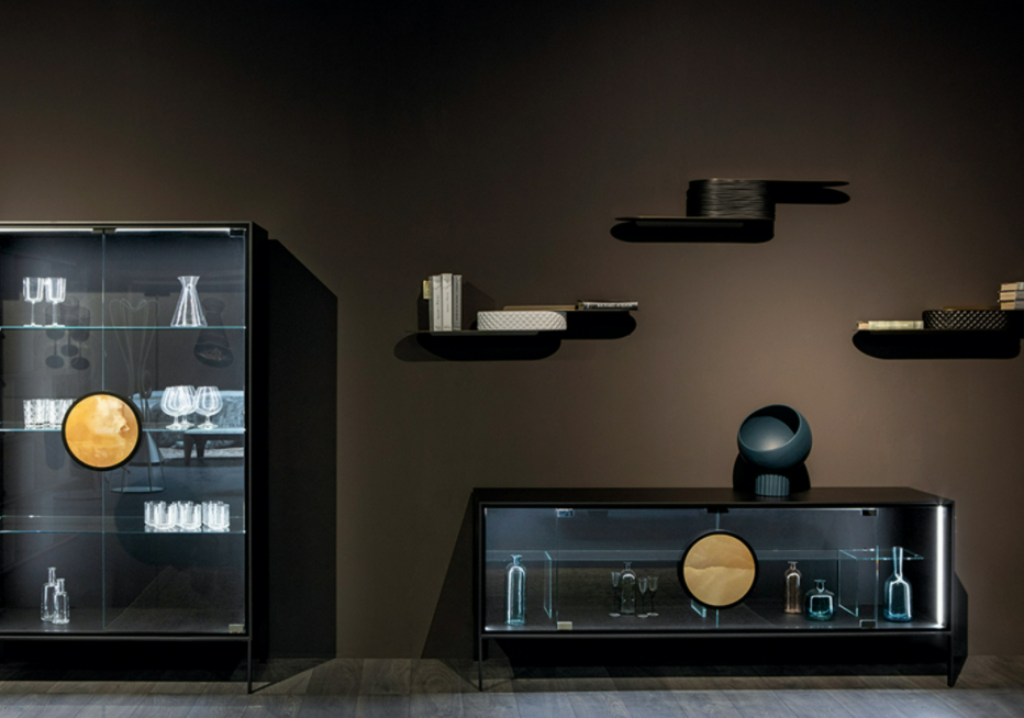 Dot è una madia minimal chic dalla forma leggera e dal carattere deciso, design elegante e dettagli preziosi: un cerchio perfetto che funge da maniglia in legno o in gres porcellanato esalta l’estetica delle ante in cristallo trasparente o fumè.