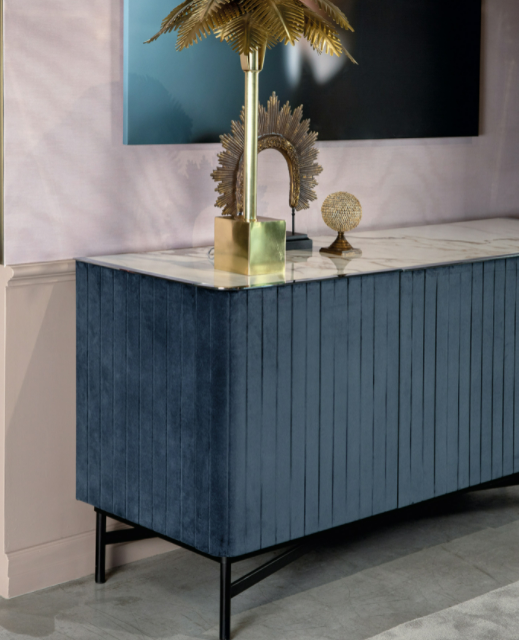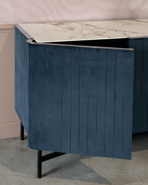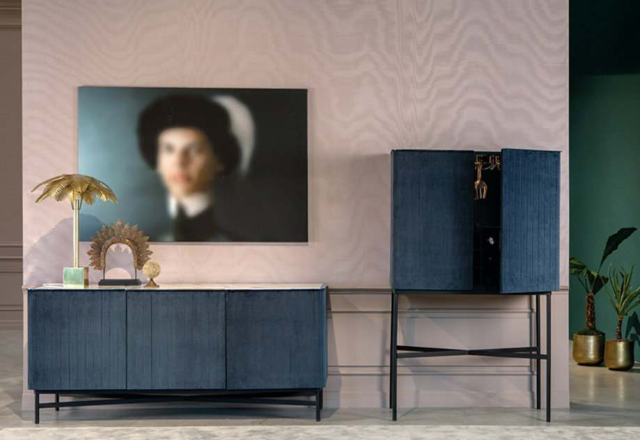 Extro, una madia rivoluzionaria che rompe gli schemi: le ante ricoperte in velluto, dal tocco dandy, donano alla sua linea stondata una sensazione morbida e sinuosa. Il top è in porcellanato, così da renderla come un diamante al centro dell’attenzione e protagonista di ogni living più raffinato.