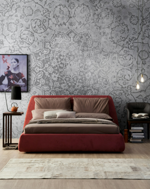 Il letto Dharma va osservato di fronte, da dove si può notare il ring perfettamente in linea con la testiera, un’unione precisa le cui giunture sono pressoché impossibili da individuare. La linea stondata esalta i colori e la texture di tessuti e pelli utilizzati per i rivestimenti, contrapponendo il grande cuscino centrale alla struttura.