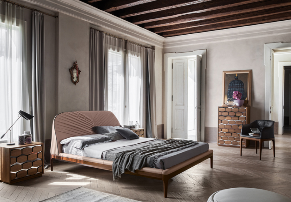La struttura in legno di Michelangelo è snella ed essenziale, e per questo fondamentale nell’esaltare la testiera, capolavoro di sartoria: tondeggiante, si riveste di eco-pelle, pelle o pelle fiore, e produce un effetto a ventaglio grazie alla lavorazione plissettata a mano. Le diverse tipologie di pelle disponibili, e le diverse colorazioni delle stesse e della struttura, rendono Michelangelo estremamente duttile e personalizzabile.