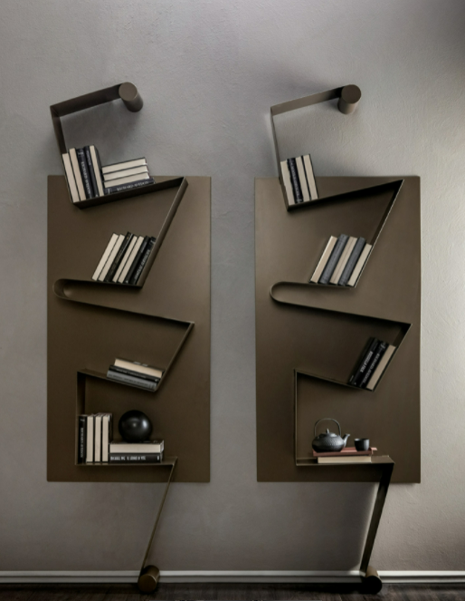 Una libreria a muro in metallo ispirata ad una nota musicale. Pratica e pensata per dare un giusto movimento ai tuoi libri.