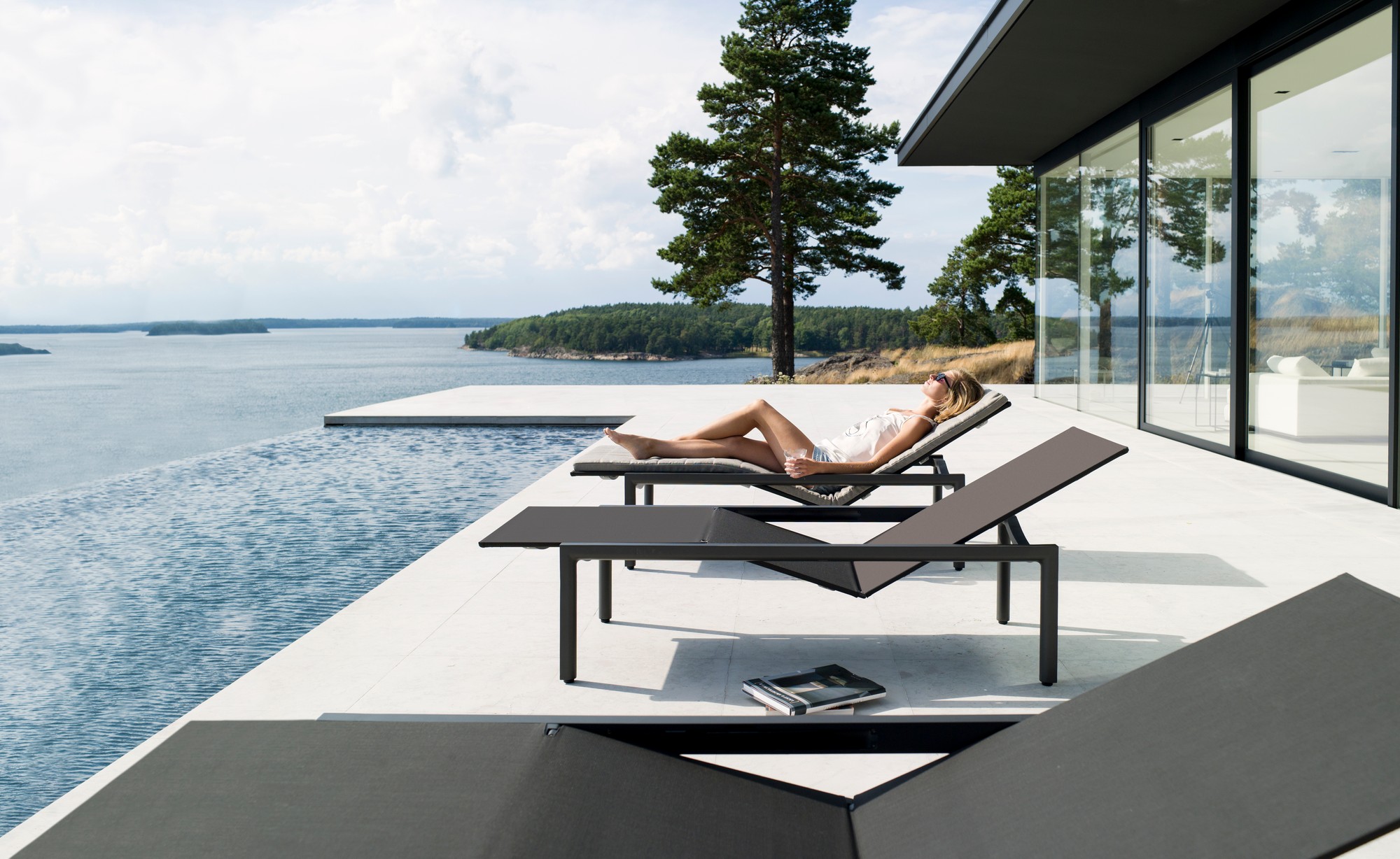 The Illum sun lounger has not only an adjustable backrest, also the seat lowers itself to offer unmatched comfort. The adjustment system, a newly developed pump system, is cleverly hidden. Enjoying the outdoor life has never been this simple and comfortable! The powdercoated aluminium frame is easy to maintain. The Batyline seat guarantees a lasting high tension, quick drying and an excellent resistance to UV rays and fungi.