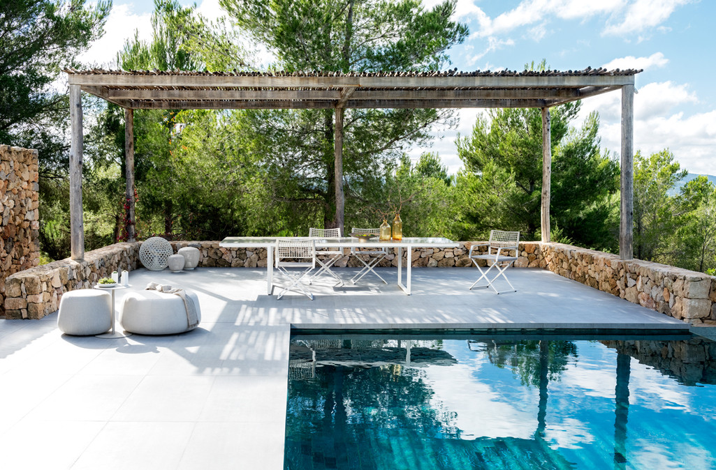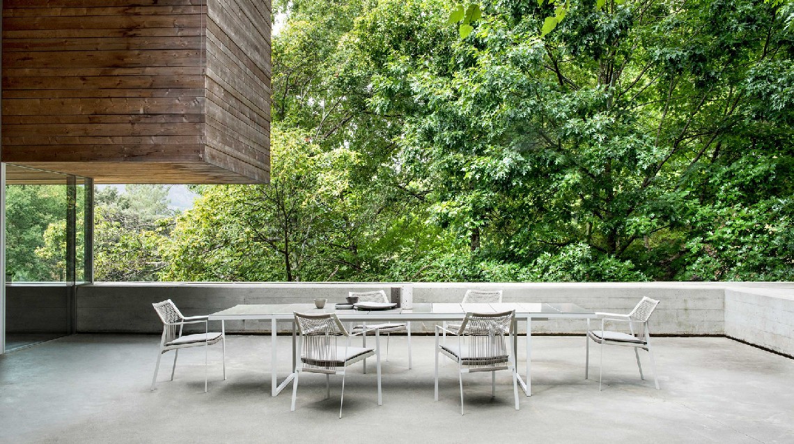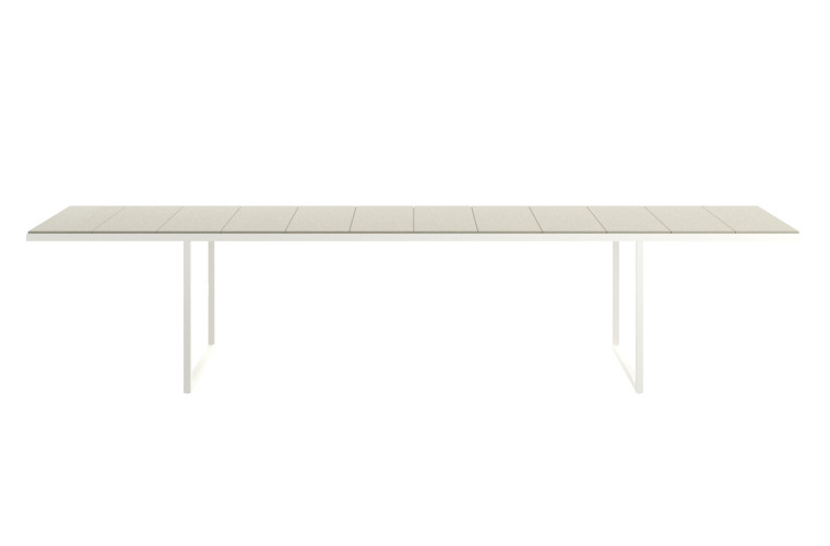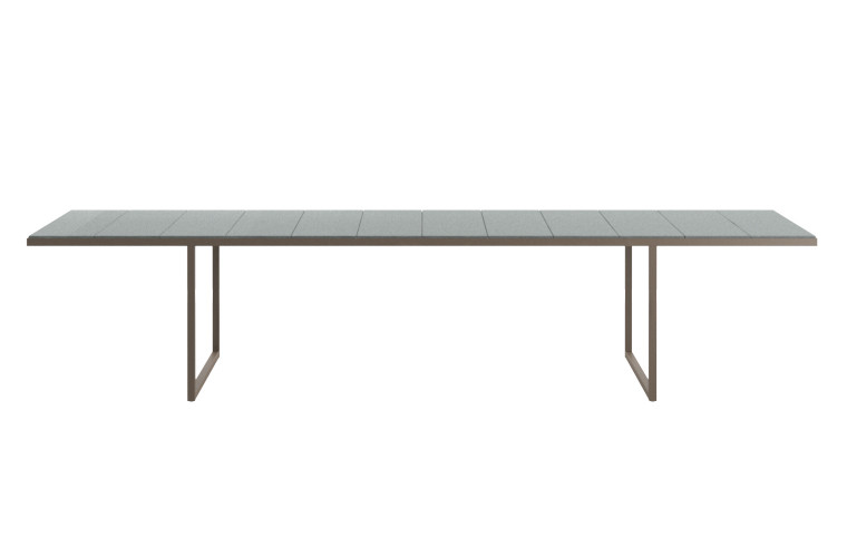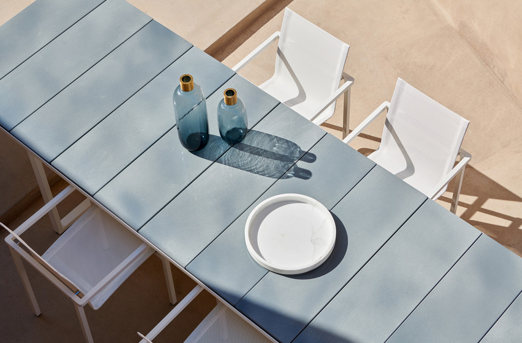 The generous Nox table is nothing short of a masterpiece, featuring a sophisticated table top of glazed lava stone. The glazed slats, made of 400-year old lava stone from the Vesuvius, mirror the sky and are reminiscent of rippling water. The coloured glazing is added by hand. Baking at a high temperature creates a subtle craquelure finish, giving each table a unique look and making the stone heat, water, UV and stain-resistant, not to mention easy to maintain. The Nox tabletop rests on a slender yet strong frame made of powdercoated stainless steel, giving the table a surprisingly light and elegant look.