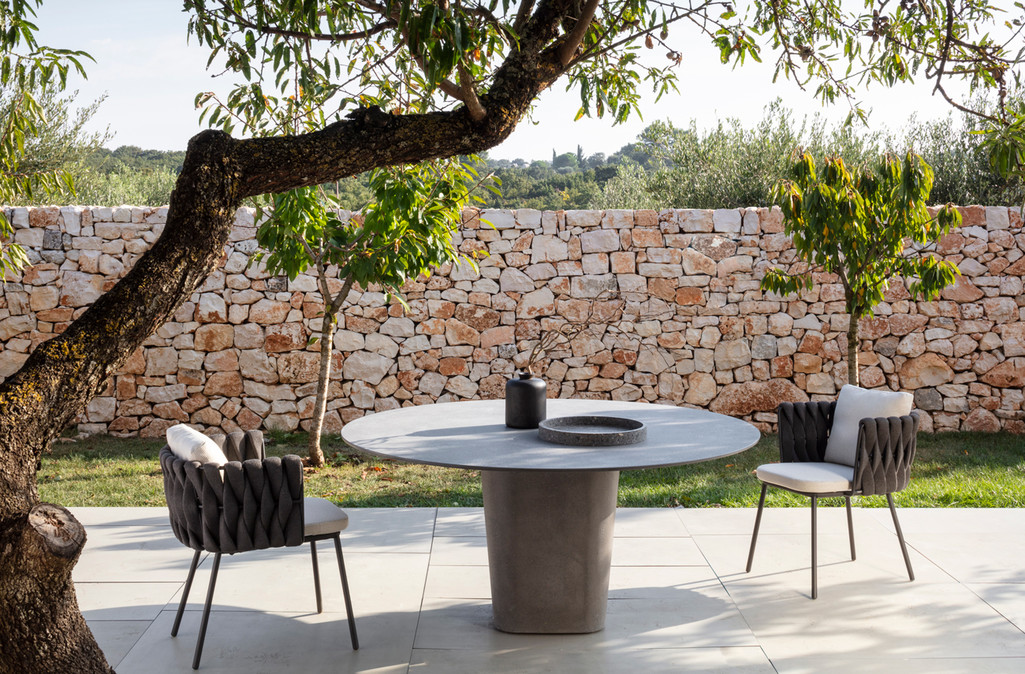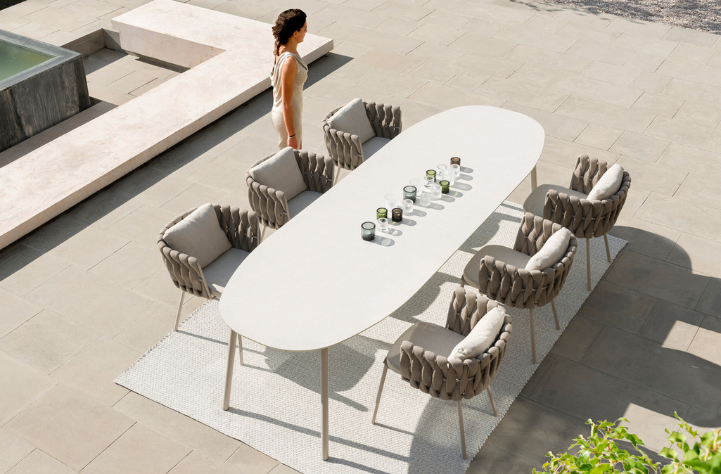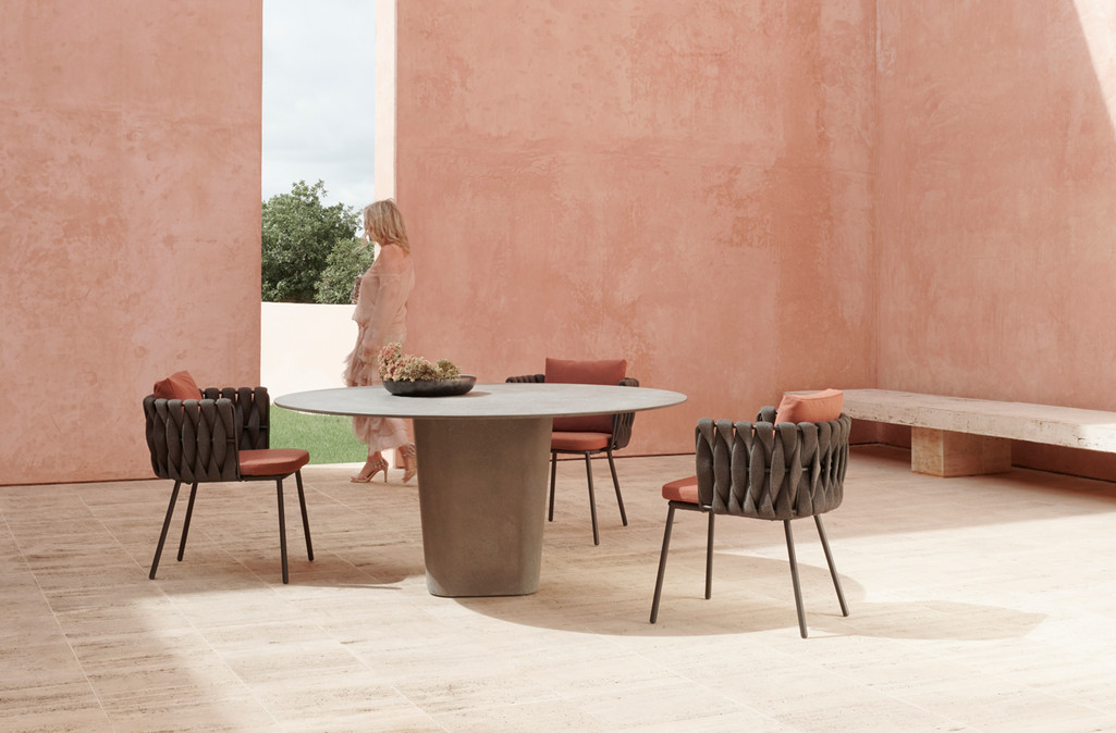 The Tosca outdoor collection is simultaneously warm and inviting, stylish and intriguing. It was the first time Tribù called upon a female designer to draw an outdoor furniture piece with a more feminine touch. Monica Armani succeeded in her challenge: rounded forms, tapered legs and an elegant seating shell in powdercoated stainless steel, upholstered with extra-wide braiding. The material for the braiding is genuinely innovative : foam mousse is encased in a seamless sheath of knitted textilene and polyolefine which makes the material weather-resistant, but also surprisingly soft to the touch.