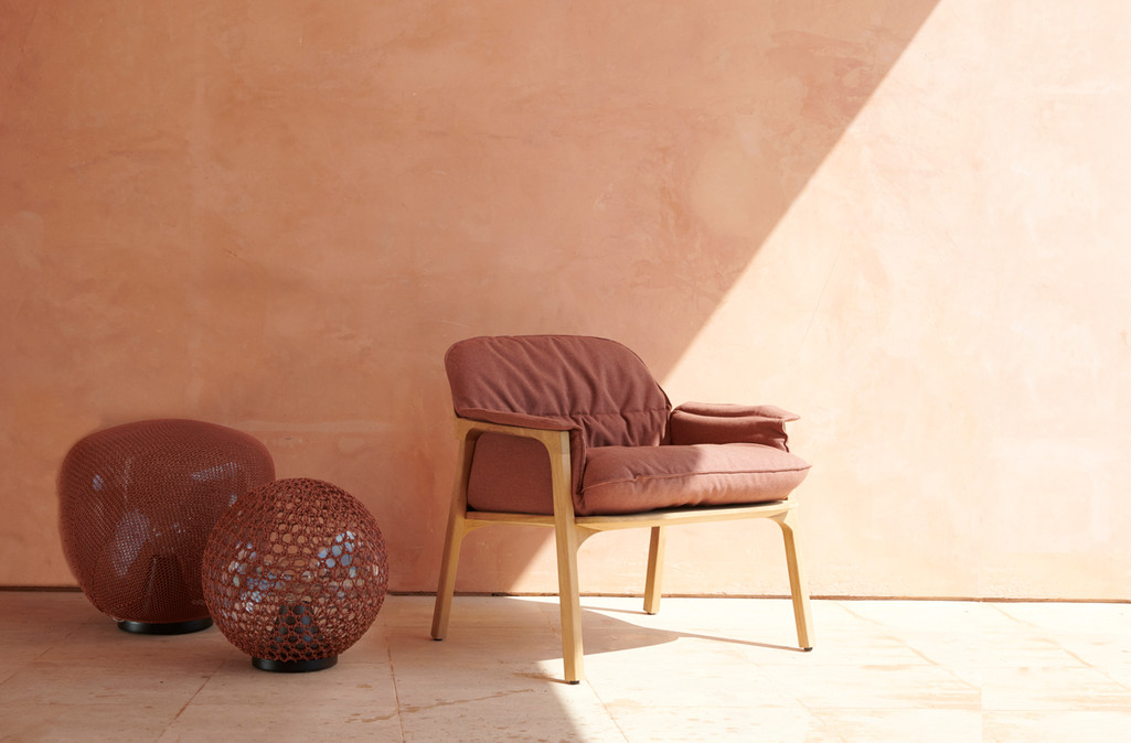 The deep cushion of the Nomad easy chair is stitched to cocoon the body, folding over the armrests and moulding into the broad curve of the backrest. Designer Monica Armani used what she calls ‘noble teak wood’ for its warmth, smoothness and strength. Slender legs and contoured armrests give the chair its elegant profile and the smartly stitched cushion is as luxurious as it is comfortable. Nomad, like its name, works well wherever it is placed, in combination with a lounge set-up or as a stand-alone piece.