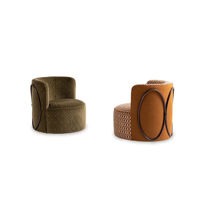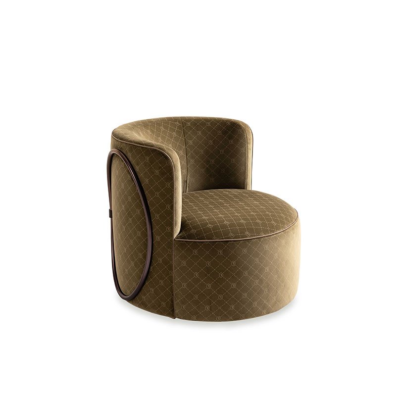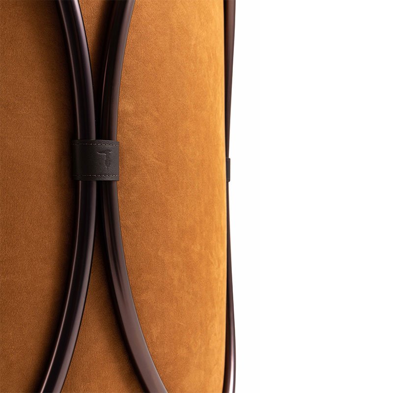The central element of the project is the metal oval, profile of the Trussardi logo: like an ancient medieval emblem, it recalls the iconic Italian spirit of the Milanese brand. Made of steel in Dark Matt Bronze finishing, it features Dark Chocolate leather details with Greyhound logo print.