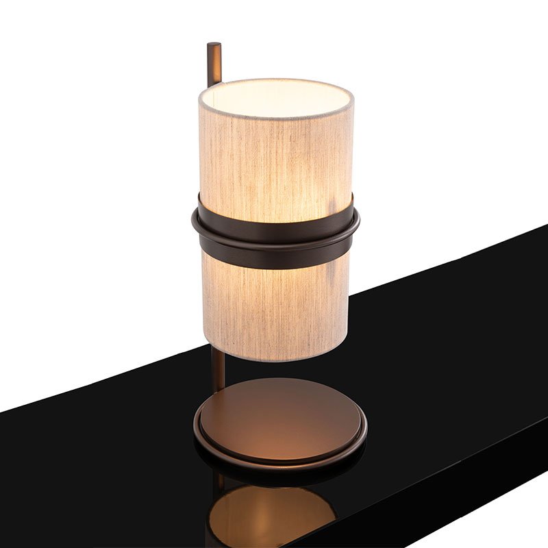 Minimalist design for the Tiubet collection of lighting. The steel band with Silk varnish bronze colour finishing supports and encircles the lampshade, then reconnects to the structure, lending the lamp a bold ‘’suspended’’ effect. The fabric is natural linen.