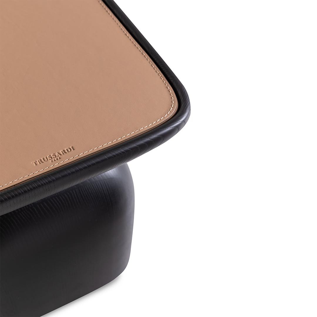 They are made from matt black ash and consist of two highly organic elements. Two large and solid bases support two wide leather tabletops, appearing as if they are suspended on the line between waking and sleeping.