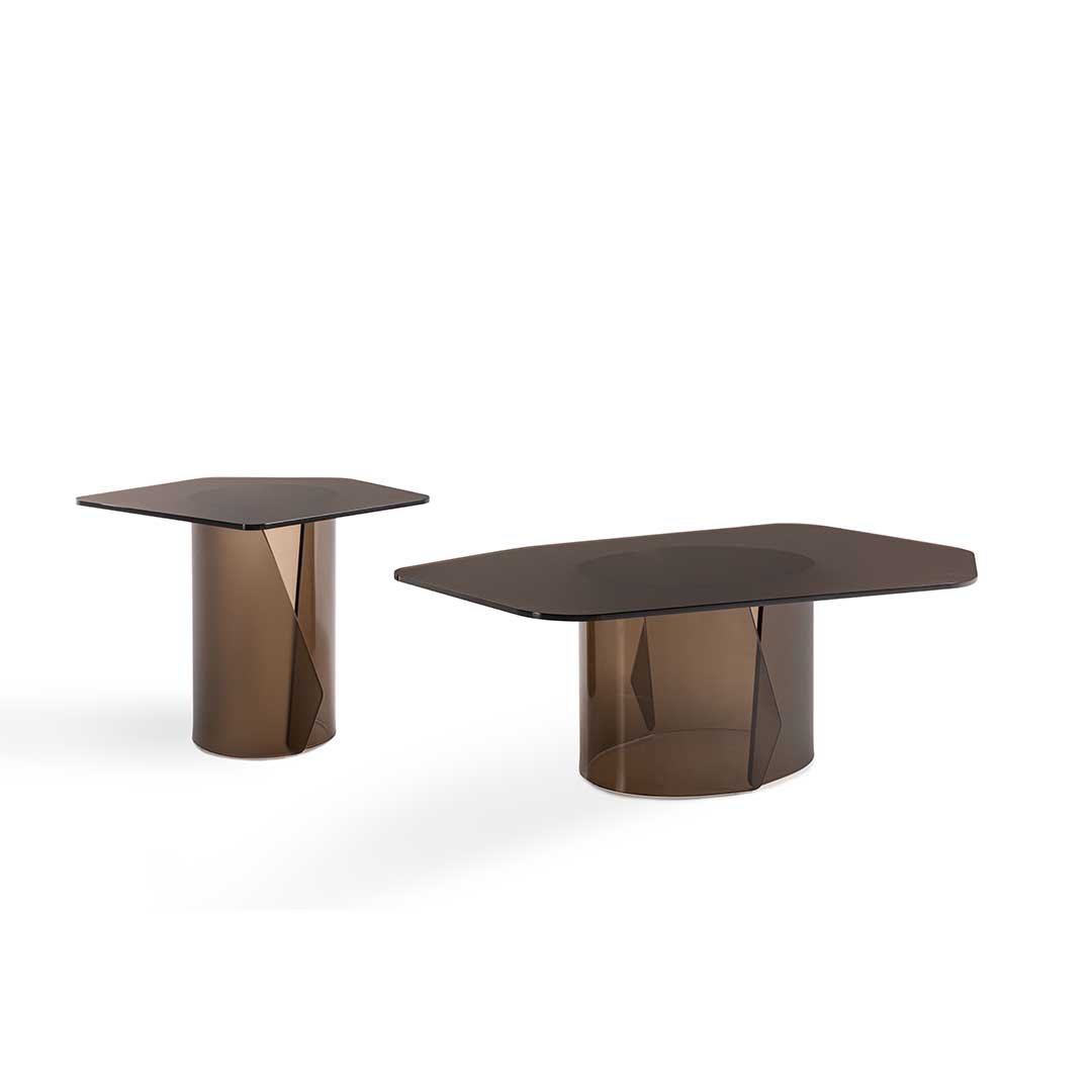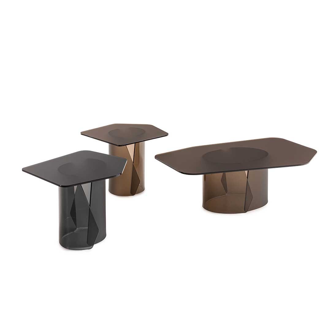 Glass top with “”soft touch”” finishing in smoke grey or bronze colour, coordinated with the base.