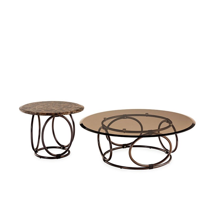 The coffee and side tables Oval present a steel frame with Dark Matt Bronze finishing and Greyhound logo on leather details in Dark Chocolate colour. Top in bronze tempered glass or Carrara White, Emperador Dark or Breccia Sarda marble.
