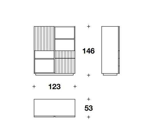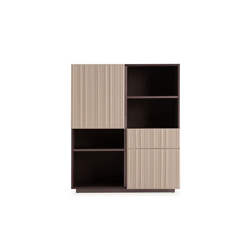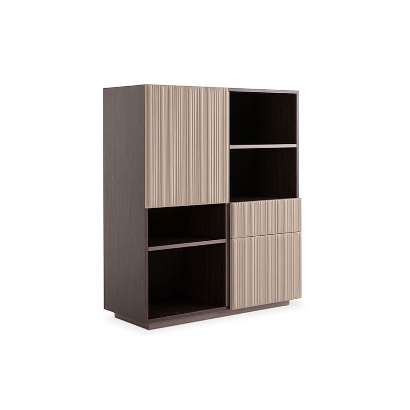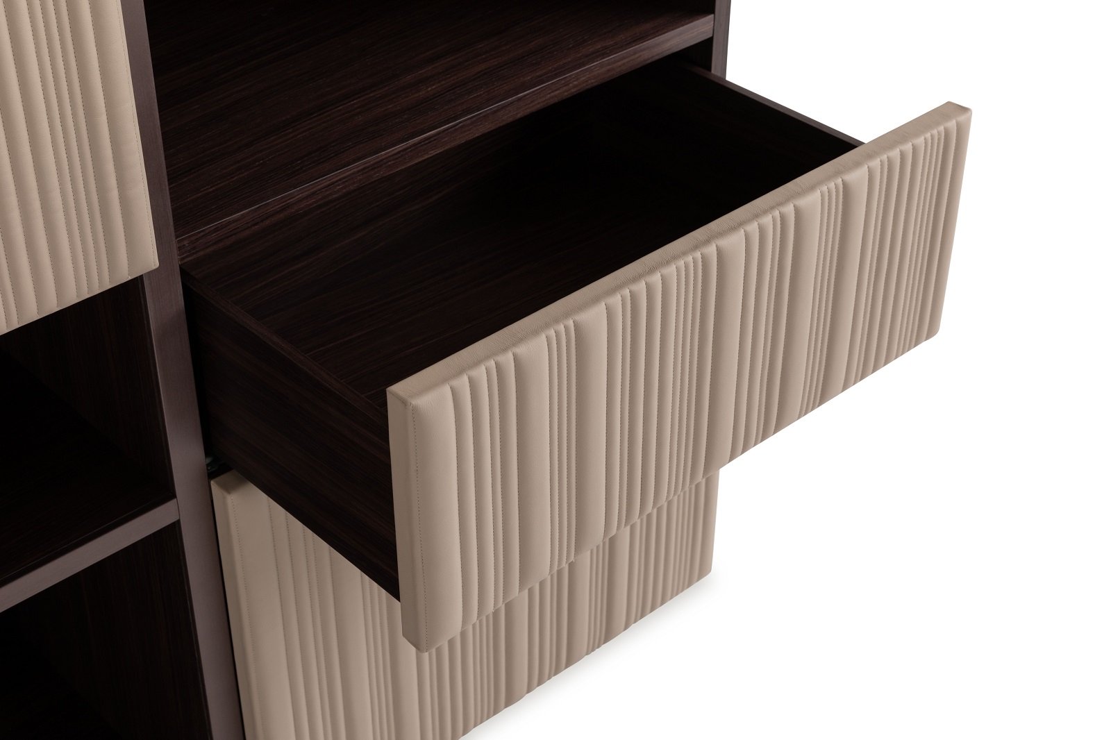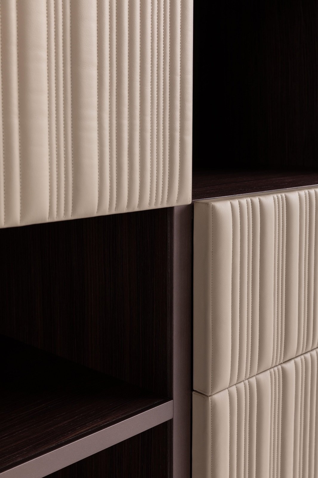 The leather doors sporting the Vertical quilting are combined with drawers and open shelving to create ideal volumes that meet all functional requirements.