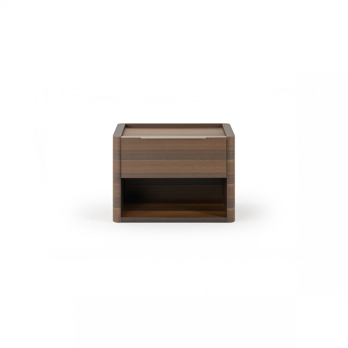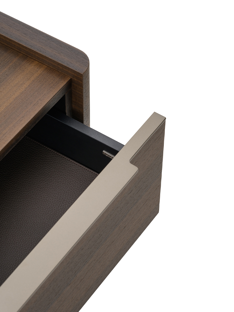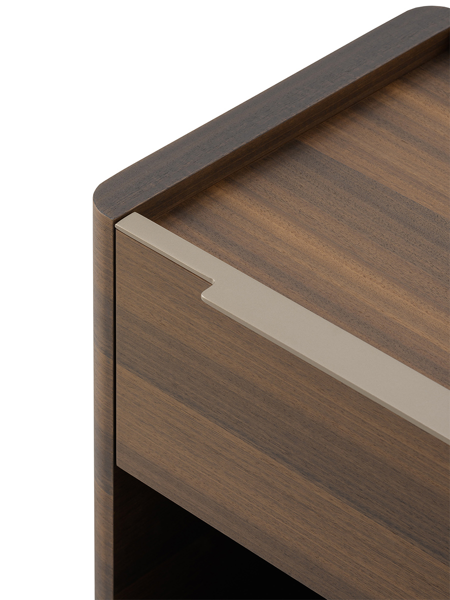 The Domus bedside table has shapes made elegant by the sides with curved corners. The structure, the top and the drawers are in Eucalyptus, the details and the handles in Matt Light Platinum metal. The Domus bedside table is available in different finishes as per sample card.