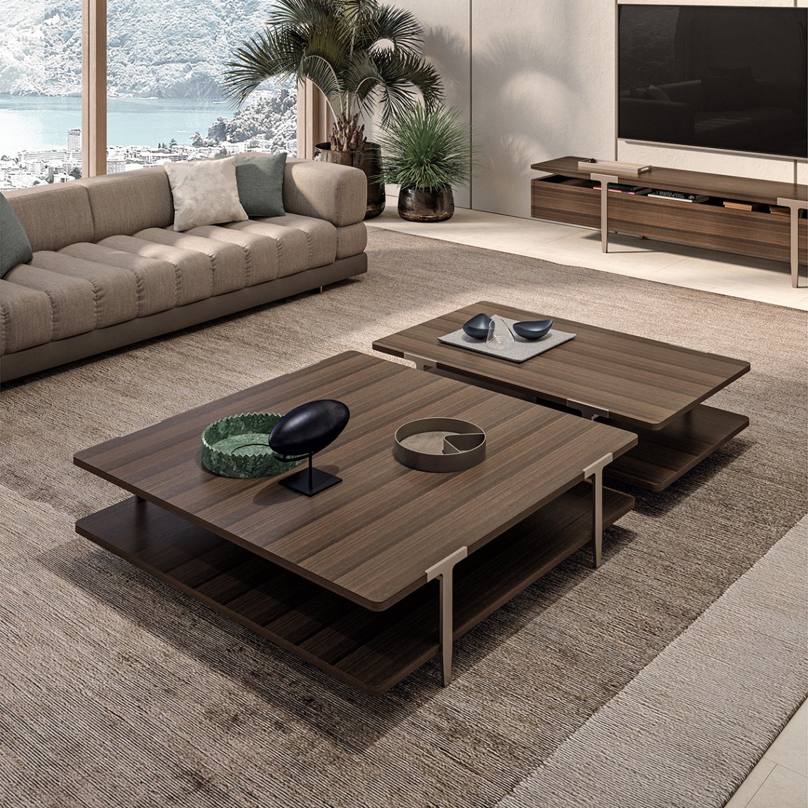 The coffee tables of the Domus collection are made of precious Eucalyptus wood, the legs are in metal and are an element that is reinterpreted in the entire collection. Available with square or rectangular top, they can be configured with an elegant marble insert. The Domus central tables are available in different finishes as per sample card.
