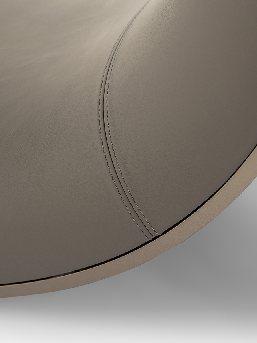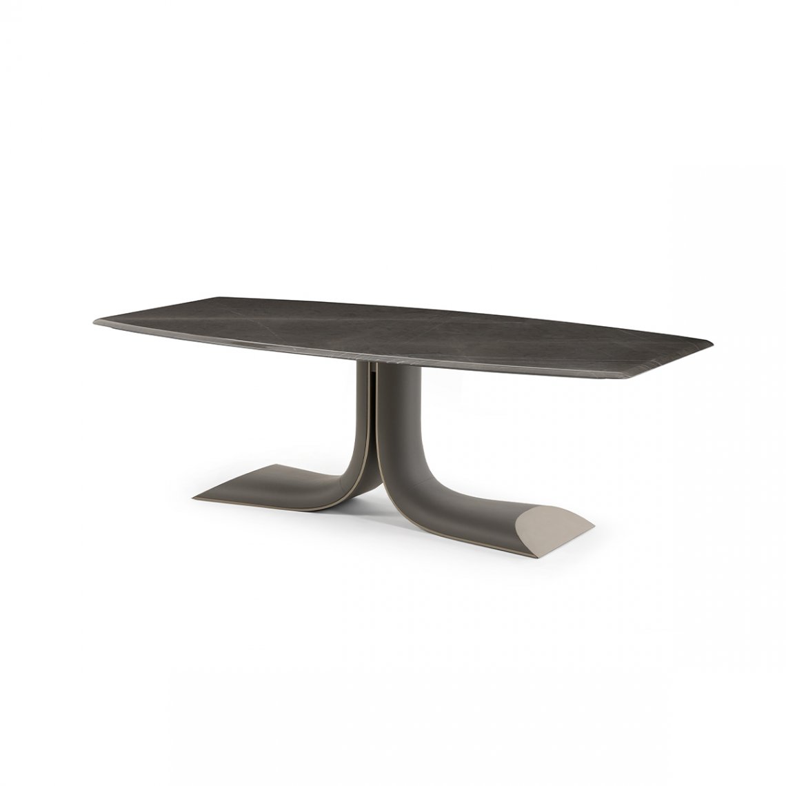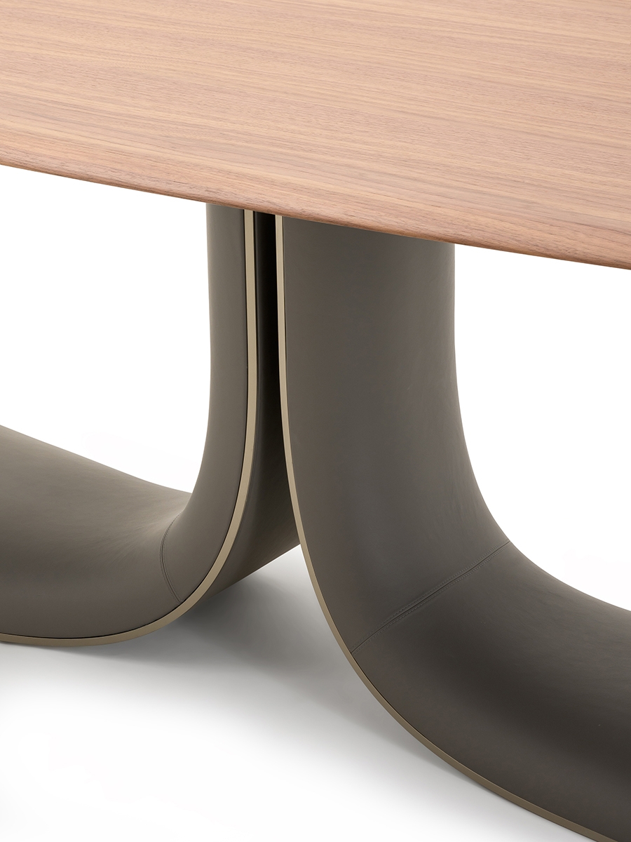 The table in the Soul collection has a soul and resides in the sinuous and elegant development of the central leg covered in leather. The deep and intense movement is interrupted on the surface, in a clear way. The slight flare towards the ground finds its counterpart in the narrowing of the support surface. The Soul table is available in different finishes as per sample card.