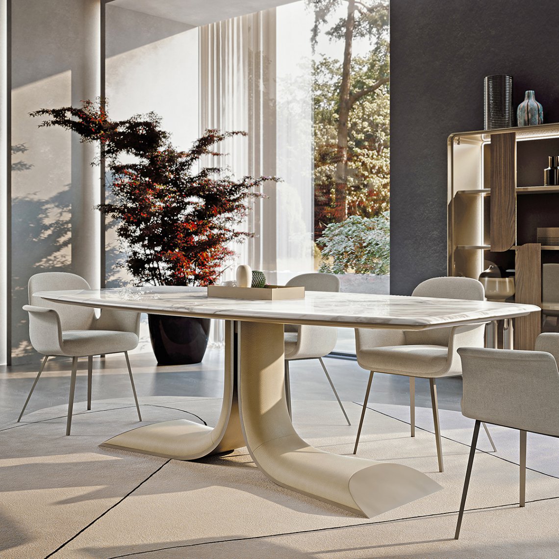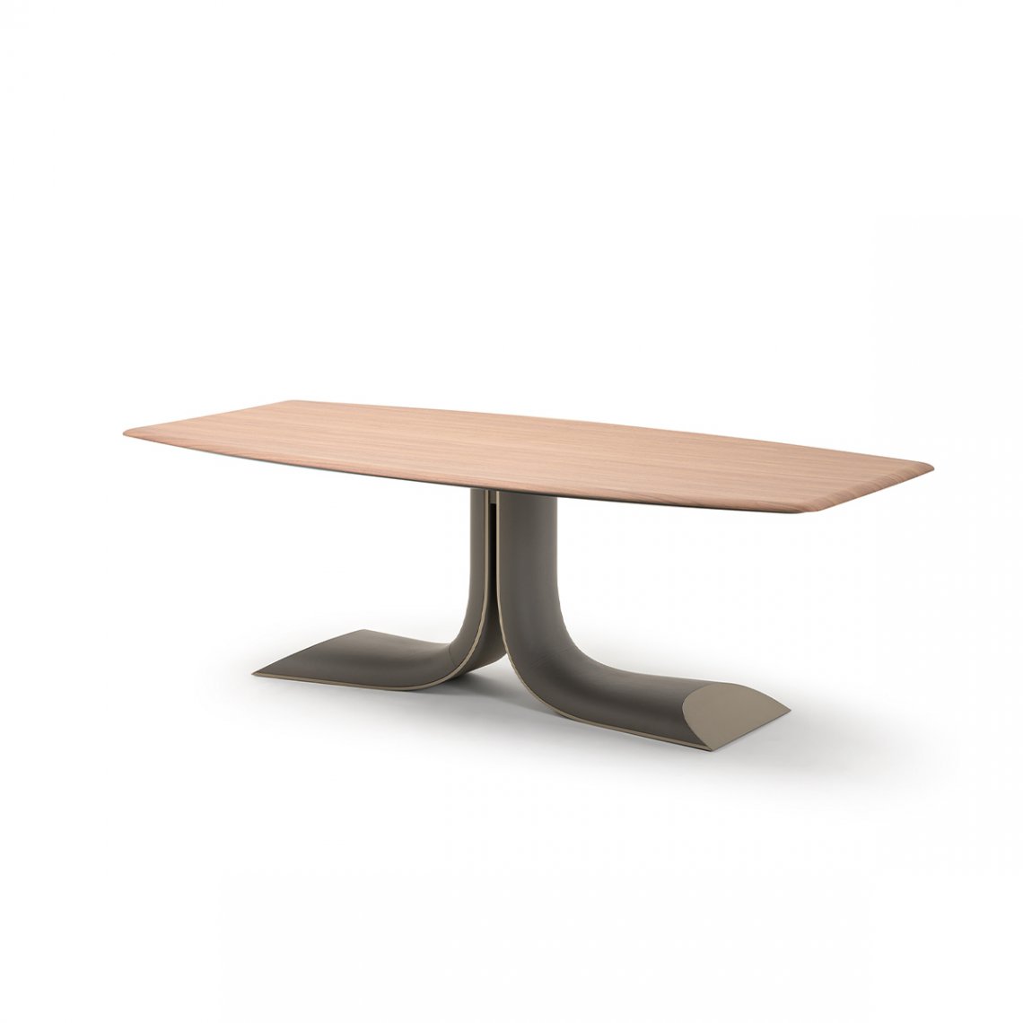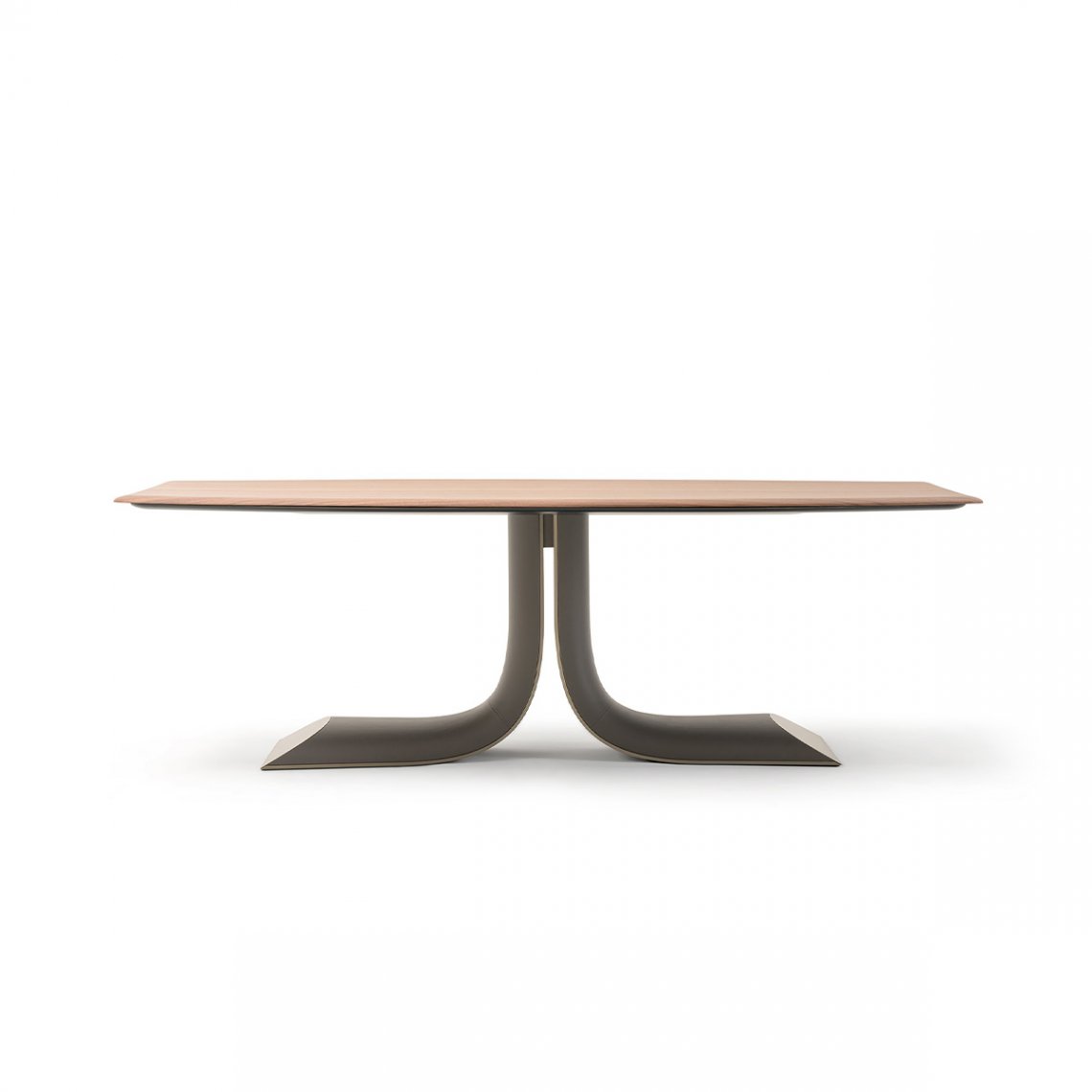 The table in the Soul collection has a soul and resides in the sinuous and elegant development of the central leg covered in leather. The deep and intense movement is interrupted on the surface, in a clear way. The slight flare towards the ground finds its counterpart in the narrowing of the support surface. The Soul table is available in different finishes as per sample card.