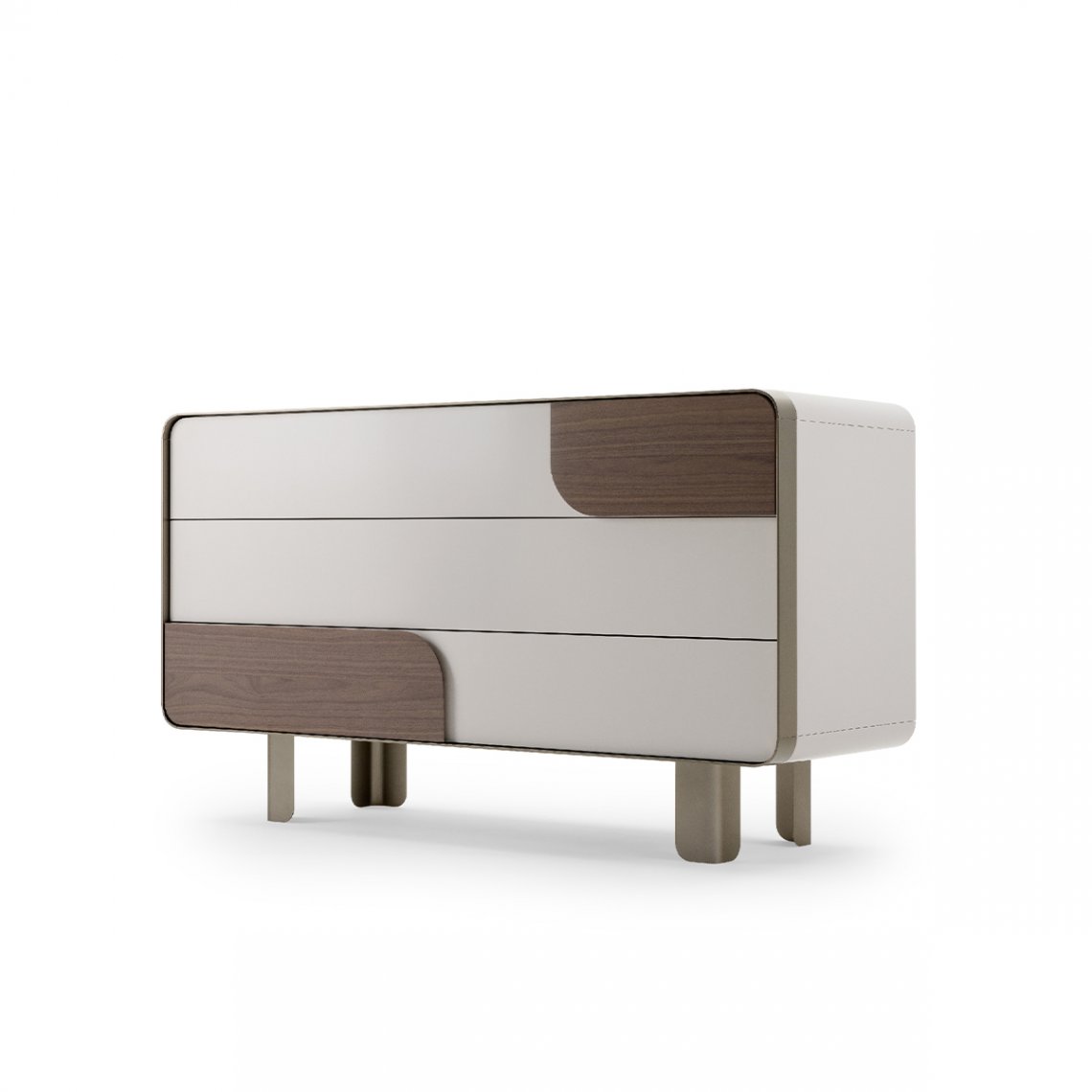 The chest of drawers of the Soul collection in glossy lacquer and wood, simple and always with a rounded line, is suspended on four sculptural feet in bent sheet metal. As for the TV cabinet, the function of the handles is resolved in the presence of inserts in walnut or marble. The Soul chest of drawers is available in different finishes as per sample card.