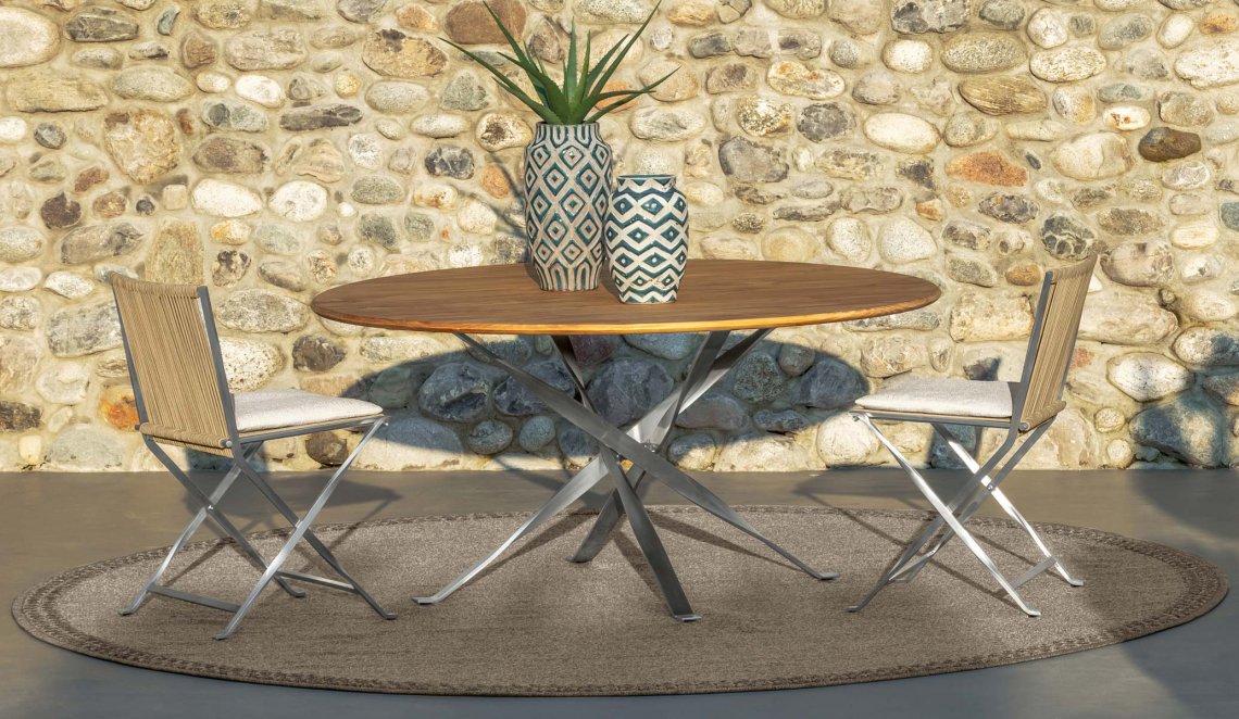 Il tavolo da pranzo rotondo D155 è l’unico tavolo della collezione George ad avere forma rotonda. Il piano, ampio e funzionale, in grado di ospitare comodamente fino a 6 persone, è disponibile in due varianti di materiali: legno di Accoya e pietra lavica che lo rendono unico nel suo genere. La struttura in acciaio inossidabile richiama lo stile su cui si basa tutta la collezione George.