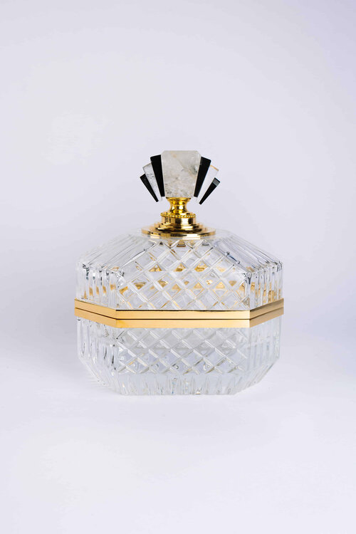 The diamond’s brightness of the french cut crystal exalts the deep color and grain of the stone. A jewel detail that embellishes this casket box in a perfectly Art Decò style and yet with a contemporary design. Each crystal is hand-cut and therefore unique.