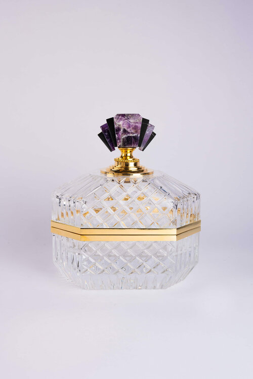 The diamond’s brightness of the french cut crystal exalts the deep color and grain of the stone. A jewel detail that embellishes this casket box in a perfectly Art Decò style and yet with a contemporary design. Each crystal is hand-cut and therefore unique.
