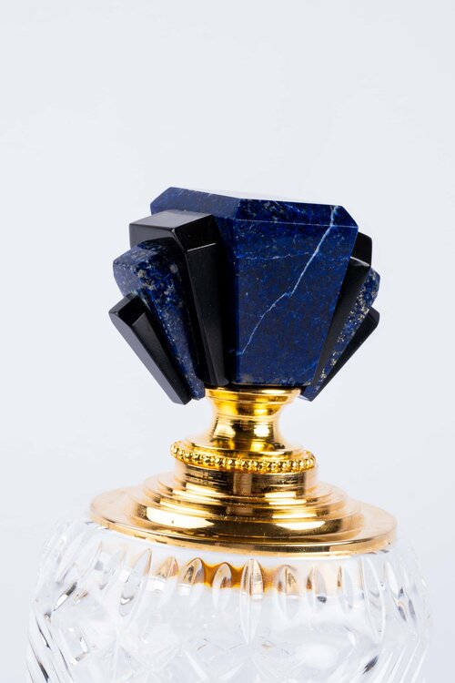 The diamond’s brightness of the french cut crystal exalts the deep color and grain of the stone. A jewel detail that embellishes the perfume bottle in a perfectly Art Decò style and yet with a contemporary design. Each crystal is hand-cut and therefore unique.