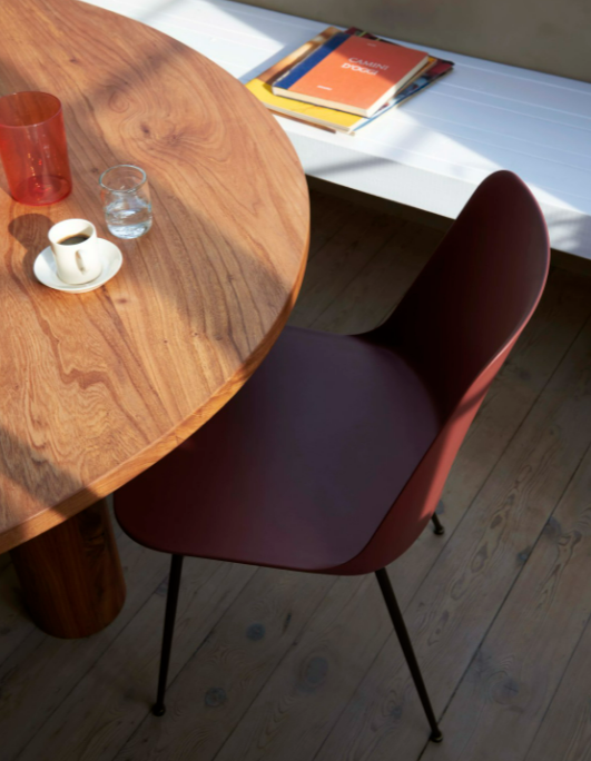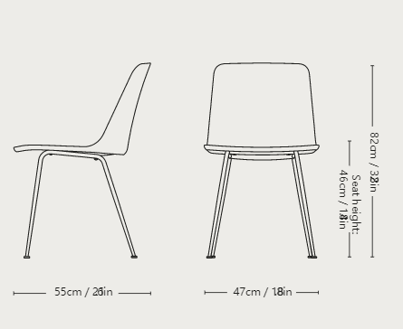 Veneer sheets formpressed together towards a solid wood insert. Milled into shape and lacquered. Natural Rattan weaved around a powder coated stainless steel frame.