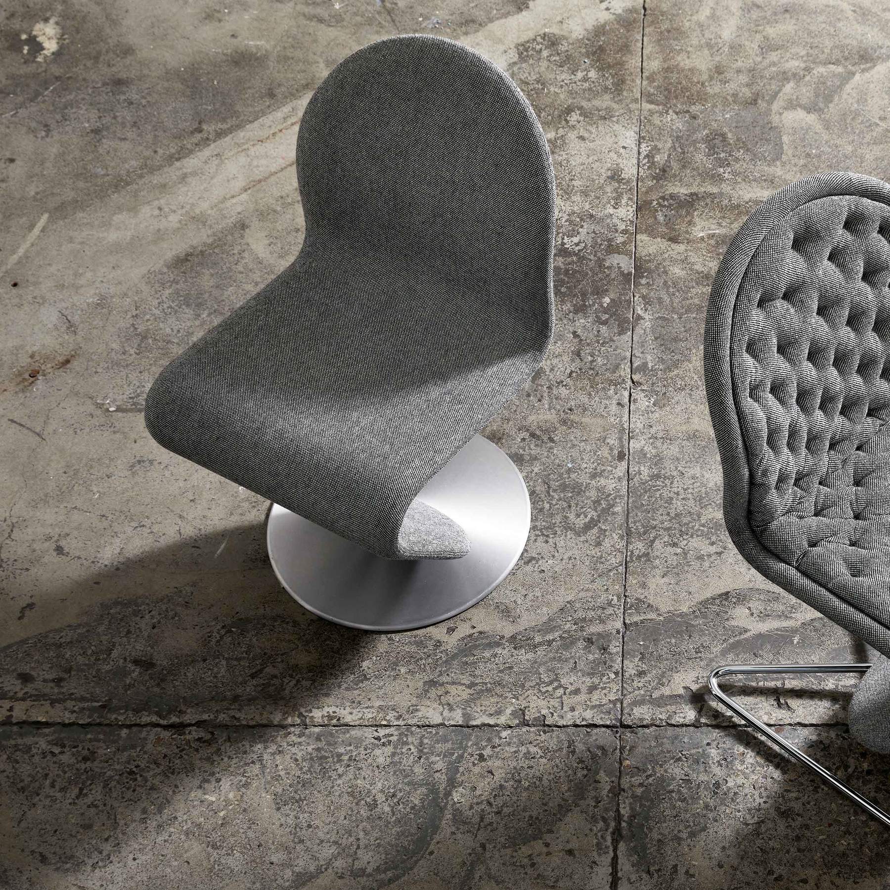 System 1-2-3 Dining Chair Standard - Round base is a fully upholstered S-shaped swivel dining chair mounted on a brushed aluminum base.