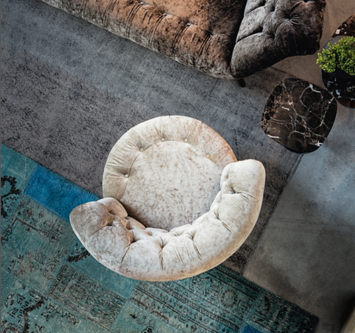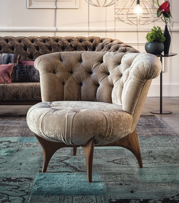 The main features of the 440 Victor armchair are its fine and elegant design with a classical touch, the characteristic button tufted backrest and the unique design of its Canaletto walnut wood legs.