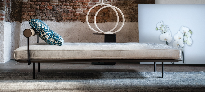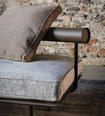 415 Tube is an extremely customizable sofa with both a traditional and innovative feel, both opulent and minimalist, and it can be combined into different variants by choosing single elements with different sizes along with corner and end elements, stand-alone sofass, chaise-longues, ottomans and panels that can be freely assembled. Armrests can take the shape of metal rolls covered with leather.