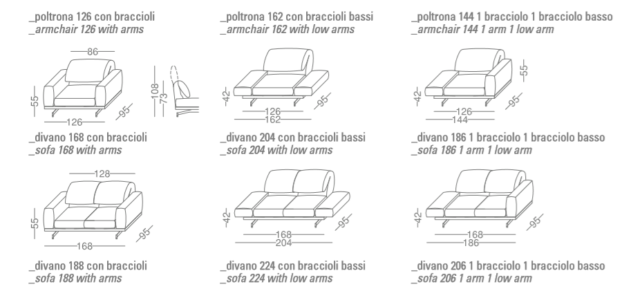 550 Altopiano is a customizable sofa and is available in three variants: with classic upholstered armrests, wing-like adjustable upholstered armrests or also with a Canaletto walnut wood small container in place of the armrest which can also be equipped with a designer lamp. It is available as a stand-alone sofa or completed with a comfortable chaise-longue.
