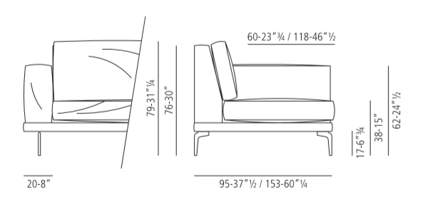 The most interesting features of the 750 Link sofa are its clear-cut and well proportioned lines which are emphasized by its tall base and metal feet.