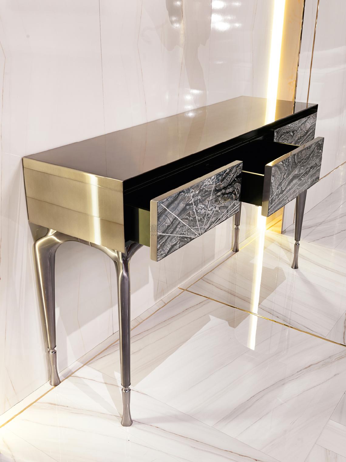 Wooden console with three drawers covered in brushed stainless steel, internal and back part in lacquered mat (RAL colours). Drawers covered in marble, framed and inlayed in stainless steel. The inlay design continues on the sides. Legs in polished aluminium cast with fifinal tips in brushed aluminium. All metal details are available in gold, bronze or black nickel fifinishing