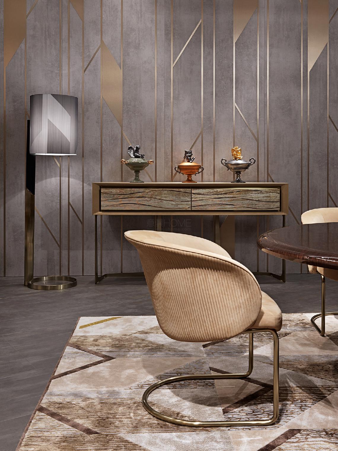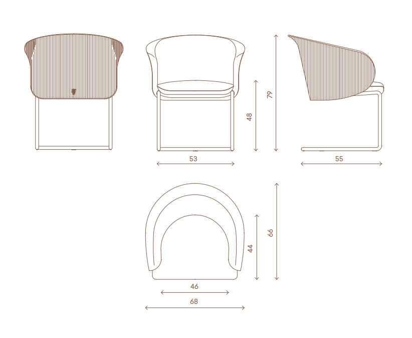 Rearback structure in curved poplar plywood, tubolar base in satinized steel, shaped and curved, seat in plywood with interwoven elastic straps 60 mm. Seat padding in polyurethane and layer in Memory Foam. Rearback padding in polyurethane with different densities. Internal upholstery in leather or fabric. External upholstery quilted with cannetté decorative motive. Metal parts available in the satinized metal fifinishing selection.