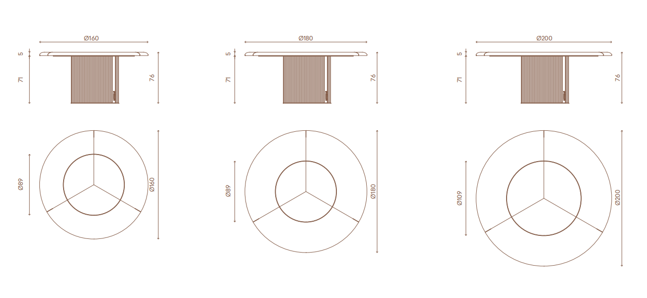Structure in wood with top and base upholstered in veneeer or lacquered, staggered base with cannetté decoration, decorative profifiles and base in satinized stainless steel with engraved Visionnaire logo. Undertop in painted aluminium. Top decorated with 3 metal friezes on the edge and turning “Lazy Susan” built in the top, removable. Wooden parts available in the veneer selection fifinishings; metal parts available in the satinized metal fifinishing selection.